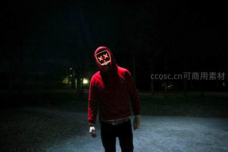 身穿红色连帽衫、佩戴发光面具的人在深夜的林间小道上行走,背景昏暗,仅靠面具微光和远处路灯照明,充满悬疑与不安感。