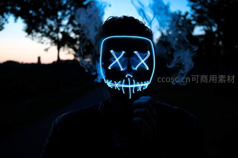 蓝色霓虹面具在黄昏暮色中散发幽光,周围缭绕着白色烟雾,背景树木剪影朦胧,整体画面充满梦幻与科幻色彩。