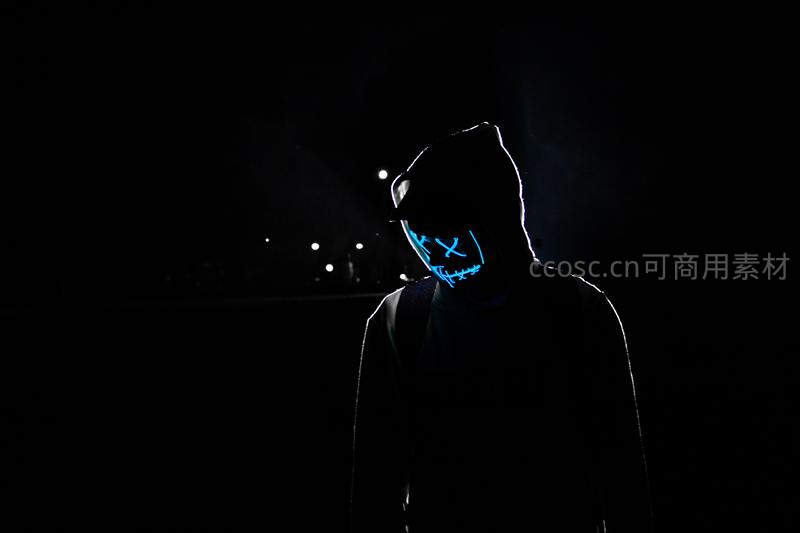 在几乎全黑的环境中,一具佩戴蓝色发光面具的身影若隐若现,仅靠面具勾勒出面部轮廓,营造出强烈的孤独感与神秘氛围。