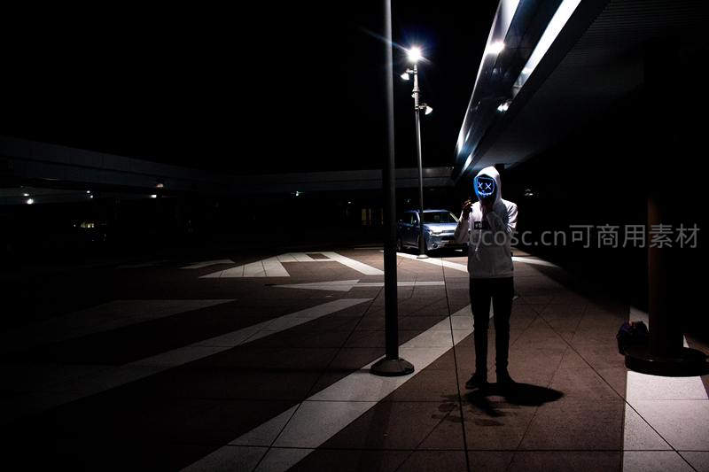 夜晚空旷街道上,一人戴发光面具站立于路灯下,光影交错,展现都市夜晚的静谧与个人风格表达。