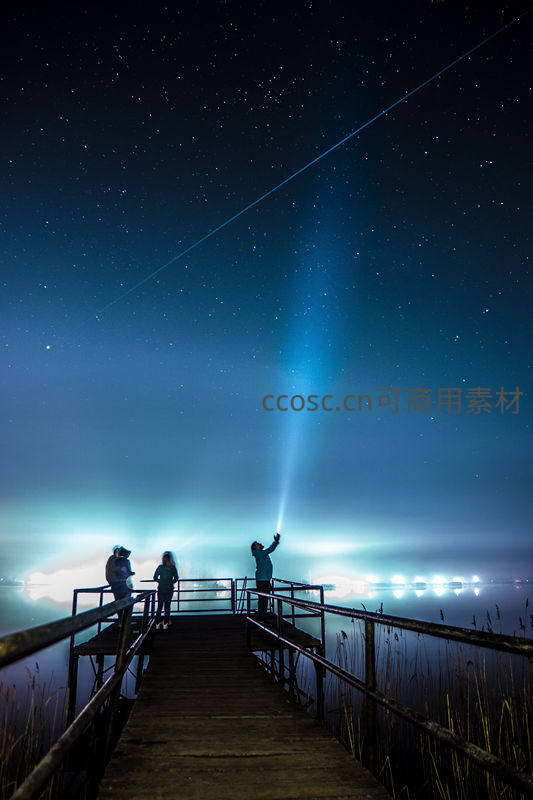 夜幕下,三人在湖边木栈道上,用手电筒射向星空,远处湖面倒映着点点星光与神秘光柱,氛围梦幻。