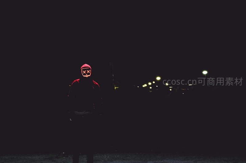 黑暗背景下,一位佩戴红色发光面具的人物伫立,远处路灯微光点缀,营造出诡异而迷人的视觉效果。