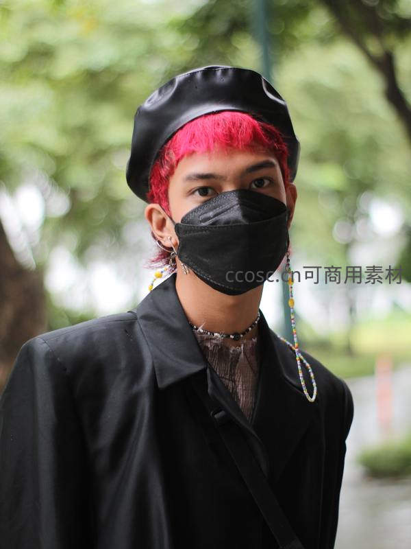 红发青年身着黑色外套搭配皮质贝雷帽,佩戴口罩与彩色耳链,在绿意盎然的户外展现前卫街头风格。