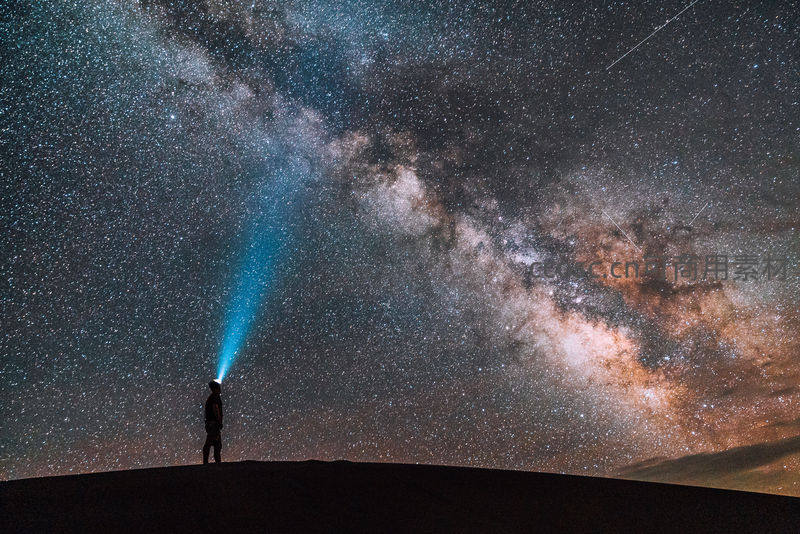 在无垠的沙丘顶端,一人伫立,手电光直指浩瀚银河,无数星辰与流星划过深邃夜空,充满探索感。