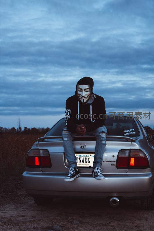 一位戴着V字仇杀队面具的年轻人坐在银色轿车后备箱上,背景是暮色苍茫的天空与旷野,营造出孤独而叛逆的氛围。