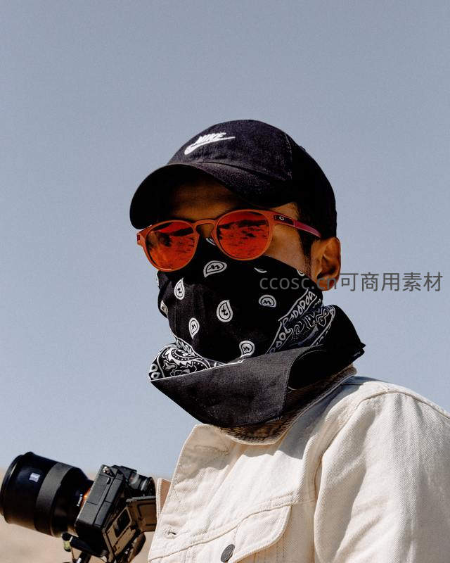 一位摄影师戴着红色反光墨镜和黑白花纹面巾,头戴棒球帽,肩扛专业相机,背景为纯净蓝天,展现出街头摄影的酷炫风格。