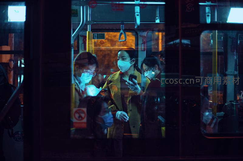 夜晚的公交车厢内,几位乘客戴着口罩,专注地低头看手机,窗外霓虹灯光映在车窗上,营造出都市夜间通勤的静谧与疏离感。