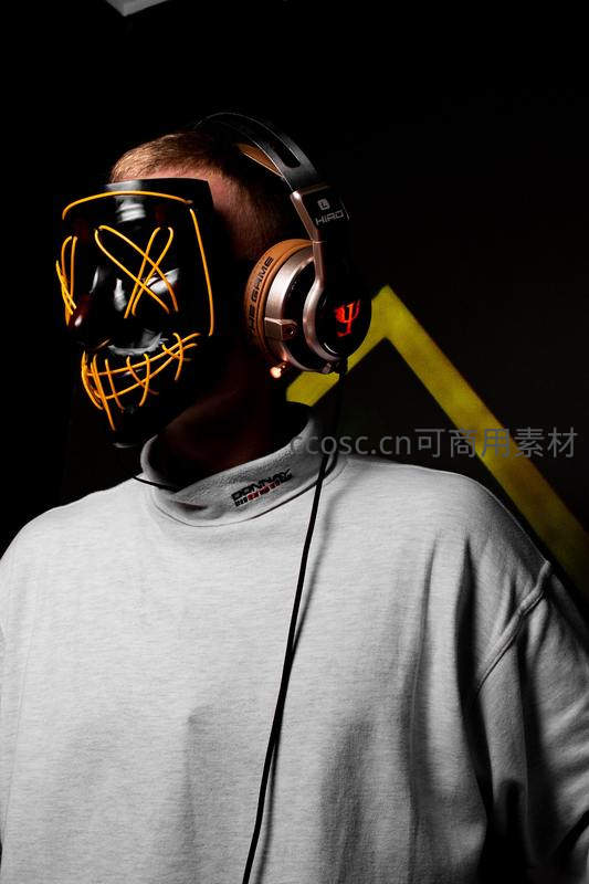 一名青年佩戴橙色LED发光面具和专业游戏耳机,沉浸在音乐世界中,背景深邃,仅以一道黄色斜线点缀,凸显未来感与个性表达。