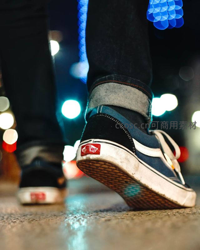 低角度拍摄一双穿在脚上的Vans滑板鞋,背景是模糊的城市霓虹灯光,展现都市夜晚的时尚与活力气息。