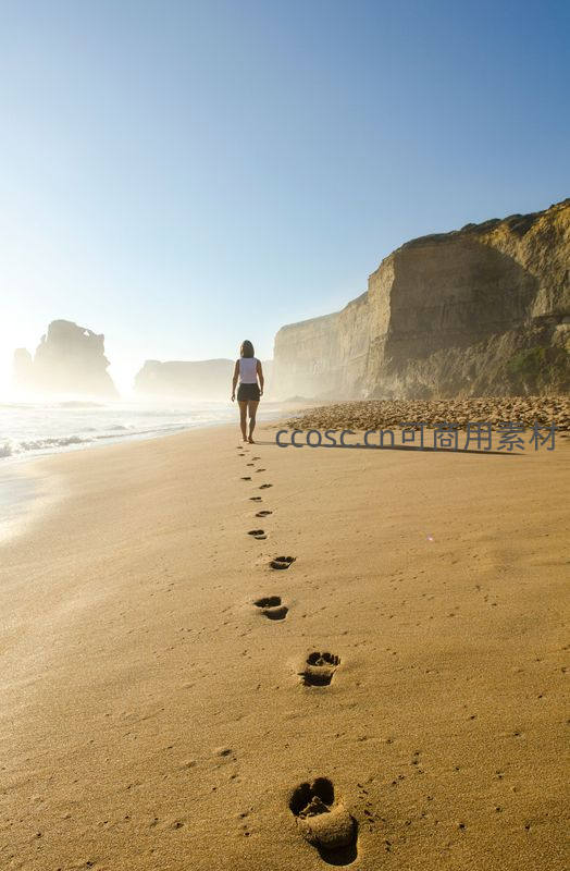 一人背影沿着沙滩上的脚印走向远方,两侧是壮丽的海岸悬崖和薄雾笼罩的海面,充满宁静与探索的意境。