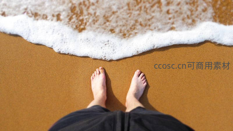 一双赤裸的双脚立于金色沙滩之上,洁白的海浪泡沫轻柔地涌至脚边,阳光洒落,营造出宁静惬意的海滨度假氛围。