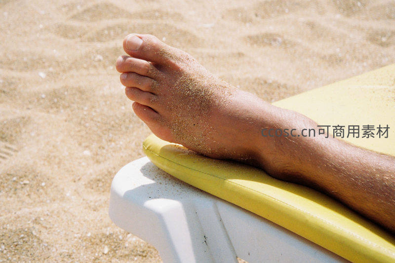 一只脚搭在黄色沙滩椅上,脚面覆盖着细软的沙粒,在明媚阳光下显得悠闲惬意,充满夏日度假氛围。