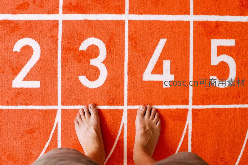从上方俯拍一双赤脚站在橙色方格地毯上,白色数字2至5清晰可见,营造居家锻炼或趣味游戏场景。