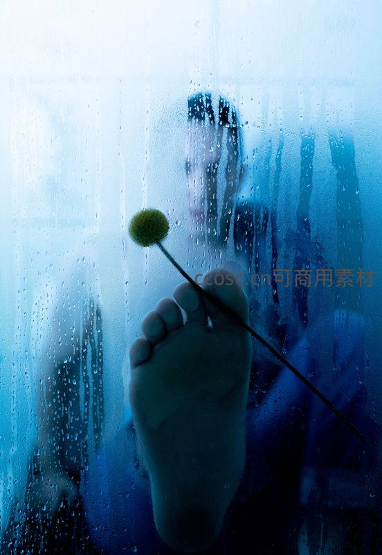 一只脚抵在布满水珠的蓝色调玻璃上,脚趾间夹着一朵小花,背景中模糊的人影增添了画面的神秘与诗意感。
