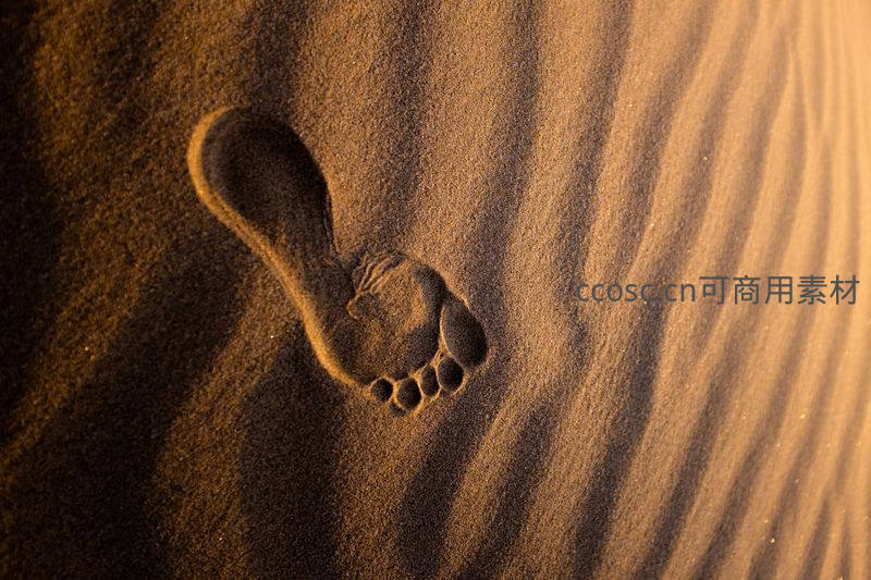 金色沙丘上一个清晰的脚印被斜阳拉长,细腻的沙粒纹理与光影交织,记录着旅人曾在此驻足,诉说着荒漠中的孤寂与壮美。