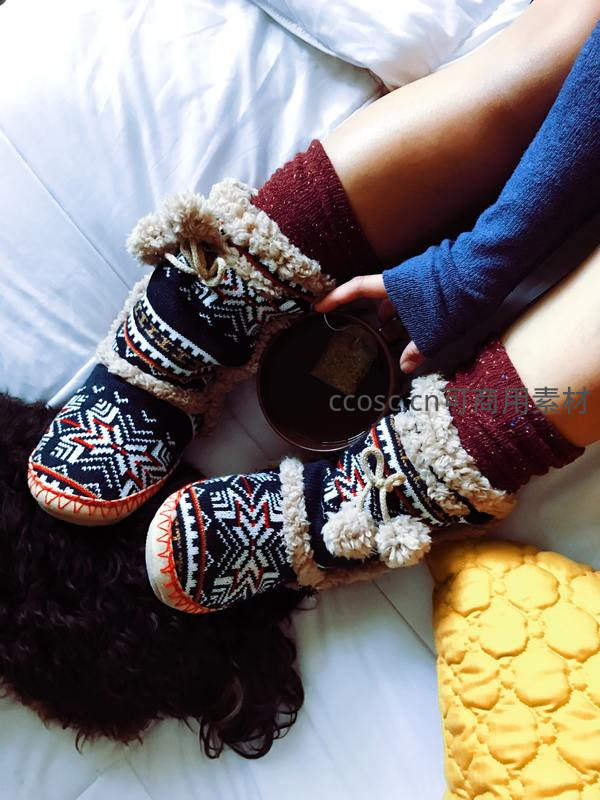 穿着毛绒拖鞋享受热饮的温馨时刻