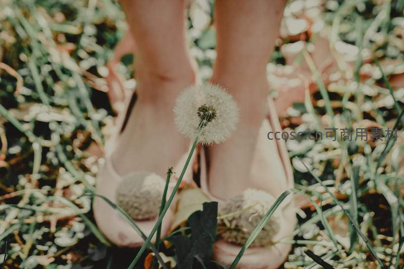 一朵洁白的蒲公英在草丛中摇曳,一双粉色平底鞋静立其旁,柔和光线与朦胧背景共同描绘出温柔的春日时光。