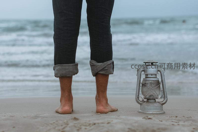 一人赤足站在沙滩上,裤脚卷起,身旁摆放着一盏金属提灯,身后是无垠大海与翻滚白浪,传递孤独与诗意的情绪。