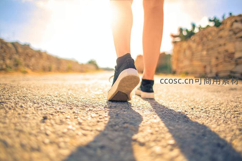 逆光下,一双穿着休闲鞋的腿走在乡间小路上,长长的影子投射在地面,背景是石墙和蓝天,画面充满自由与探索感,适合表现旅途中的惬意与思考。