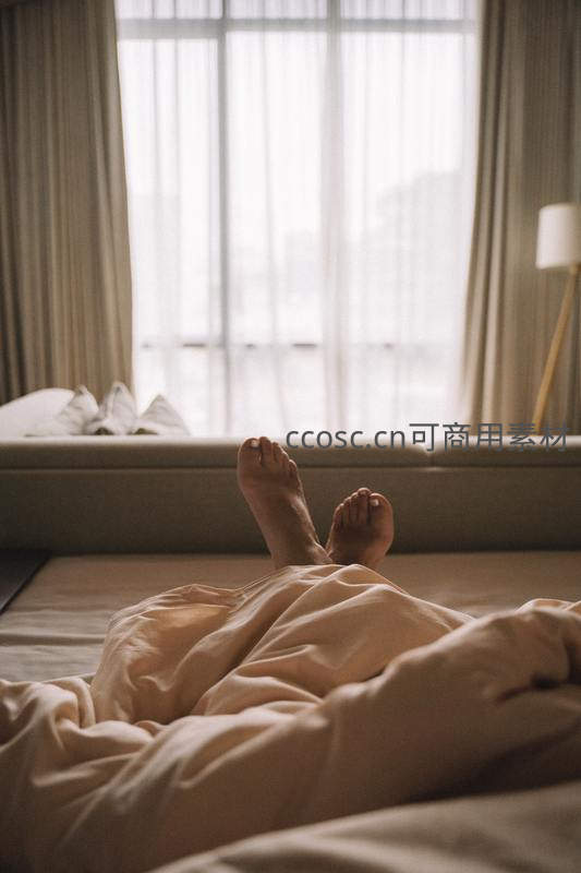 床上一双裸足从被窝中伸出,窗外光线柔和,营造出慵懒舒适的居家氛围,是悠闲时光的写照。