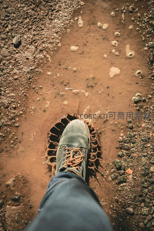 徒步靴踩进泥坑溅起水花