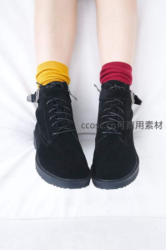 一双黑色绒面短靴搭配黄红撞色堆堆袜,坐在纯白背景前,凸显色彩对比与现代穿搭的精致感。