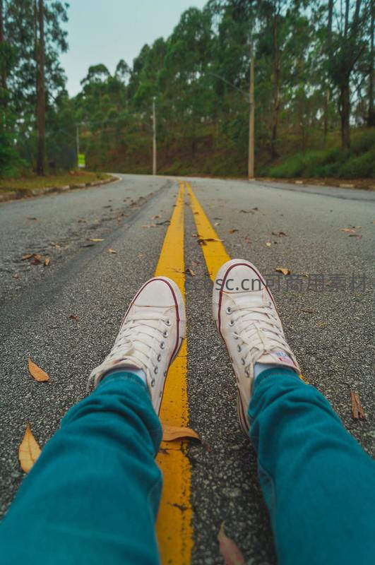 双脚跨坐于双黄线之上,眼前是蜿蜒入林的小路,落叶点缀其间,营造出一种随性不羁的旅行氛围,充满探索的期待。