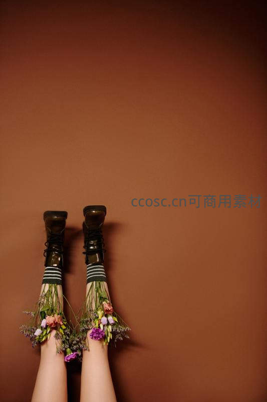 一双黑色靴子的脚踝处缠绕着色彩斑斓的小花束,在纯棕色背景下显得格外清新浪漫,展现了独特的艺术表达与生活美学。