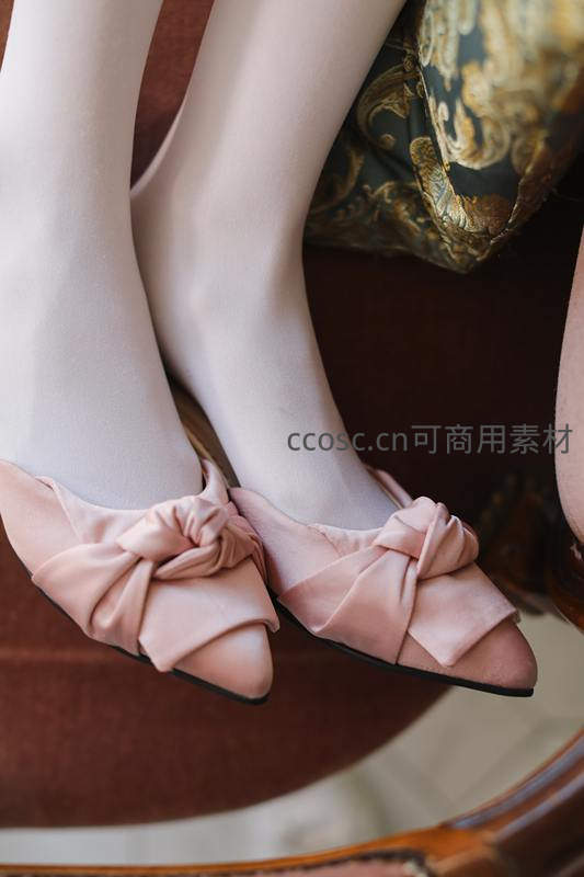 粉色蝴蝶结平底鞋搭配丝袜的优雅特写
