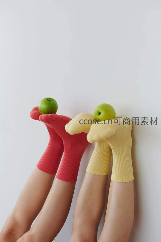 两只穿着红黄袜子的脚丫以独特姿势托起青苹果,背景纯白突出主体,充满童趣与视觉冲击力。