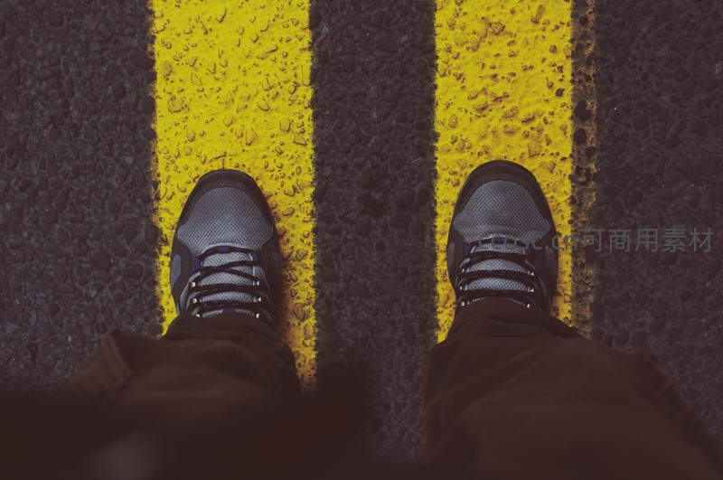 一双运动鞋稳稳站在柏油路的黄色标线上,简洁构图凸显城市交通规则与日常行走的秩序感,充满现代生活气息。