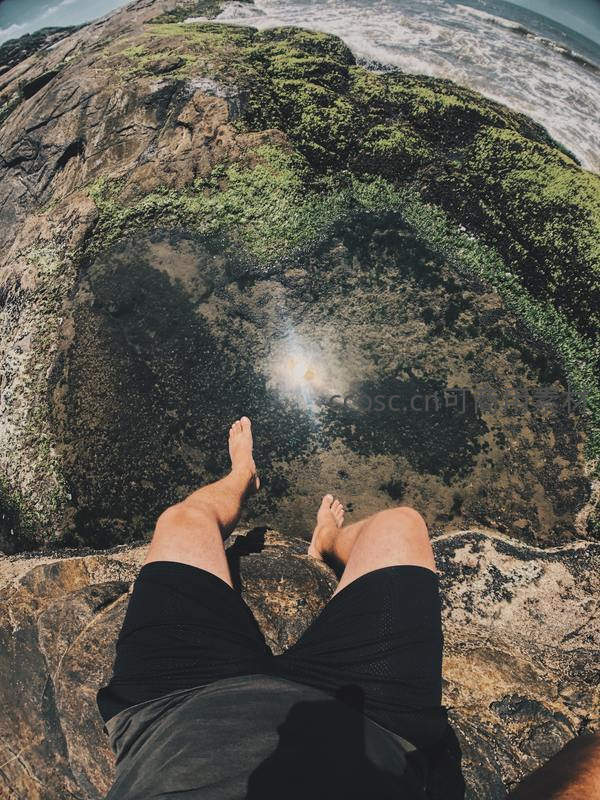 从高处俯瞰,双脚悬于布满青苔的礁石边缘,下方海水轻拍,展现人与自然的壮阔对话,充满冒险与宁静之美。