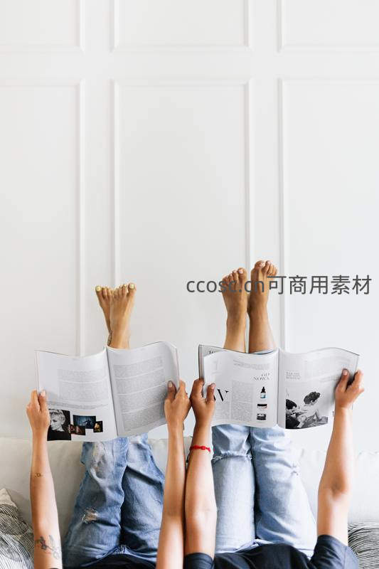 两人并排躺在沙发上,脚丫朝天,专注翻阅时尚杂志,简约白色背景衬托轻松自在的午后时光,彰显现代生活情调。