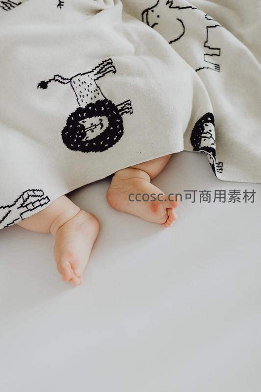 柔软的白色卡通毛毯下,露出一双粉嫩的婴儿小脚,画面充满童真与温暖,营造出宁静舒适的居家氛围。