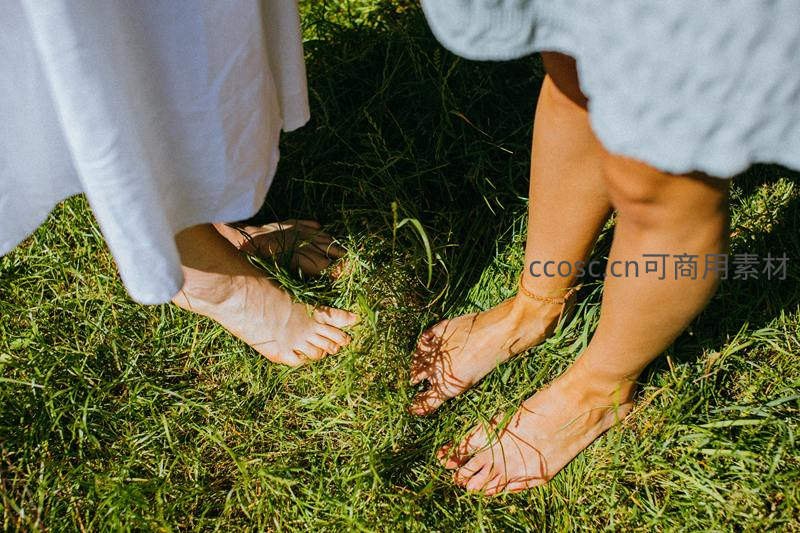 两位女性赤脚踩在翠绿草地上,阳光洒落,裙摆轻扬,感受大地温度,体验亲近自然的宁静与自由。