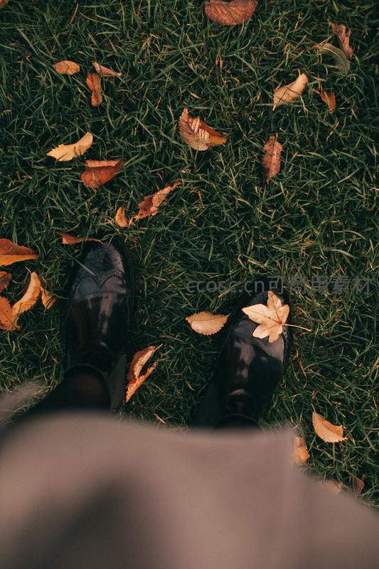 从第一视角俯瞰,一双黑色亮面皮鞋站在铺满金黄落叶的绿茵草坪上,尽显秋日的沉静与绅士风度。
