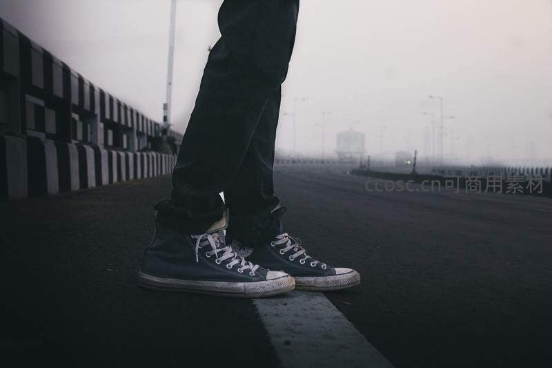 雾中街头,帆布鞋静立空旷公路的孤独剪影