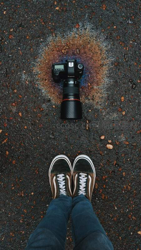 从第一人称视角俯拍,一台专业单反相机放置在粗糙的柏油路上,前方是一双经典的黑白帆布鞋,展现摄影爱好者的生活瞬间。