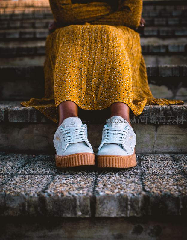 一位女性坐在石阶上,身穿明黄色碎花长裙,脚踩一双浅蓝色厚底运动鞋,画面聚焦于鞋履与裙摆,营造出悠闲惬意的都市氛围。