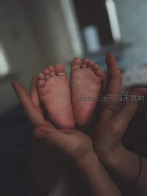 一双成人的手轻轻托起婴儿娇嫩的双脚,画面充满爱意与宁静,背景虚化突出主体,传递出初生生命的纯净与被珍视的温暖。