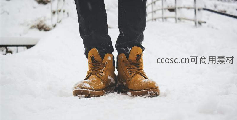 一双沾满雪花的棕色工装靴稳稳立于洁白雪地,裤脚微卷,背景是模糊的栅栏,勾勒出冬日户外活动的坚实与温暖。