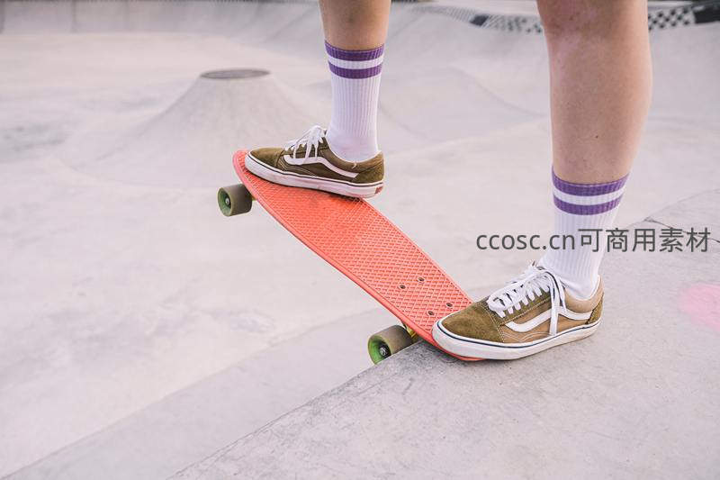 一位年轻人脚踩棕色帆布鞋和紫白条纹袜,在滑板场边缘操控橙色滑板,姿态专注,彰显街头文化与年轻活力的动感魅力。