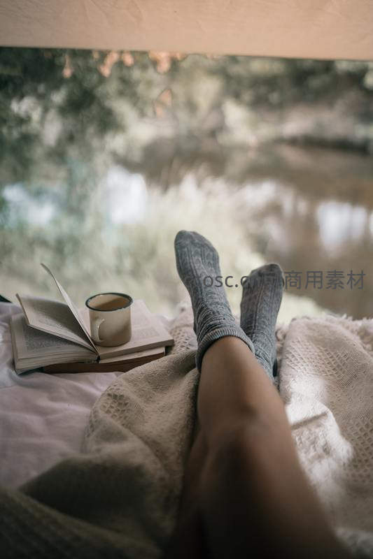 在柔和的窗边光线下,一双穿着灰色毛袜的脚悠闲地搭在毯子上,身旁是翻开的书和一杯热饮,营造出宁静惬意的居家阅读氛围。