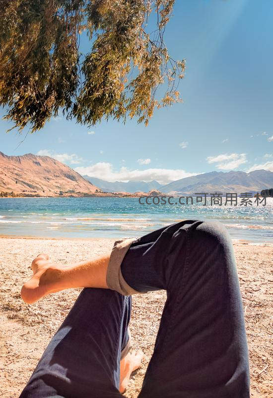 在宁静的湖边沙滩上,有人悠闲地躺着,享受着树荫与阳光,远山如黛,碧水荡漾,是逃离喧嚣、放空心灵的理想之地。
