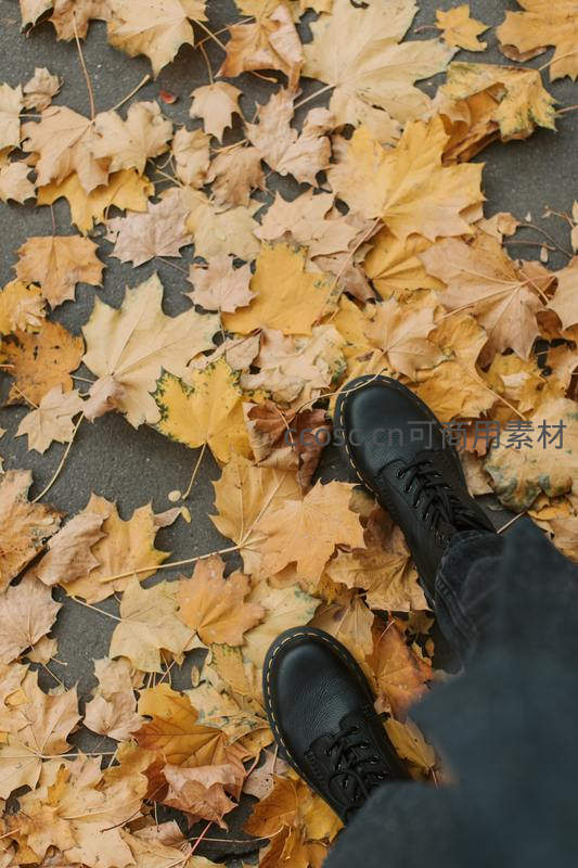 黑色马丁靴踏在满地金黄枫叶之上,地面斑驳纹理与落叶色彩交织,展现秋季街头的文艺与温暖氛围。
