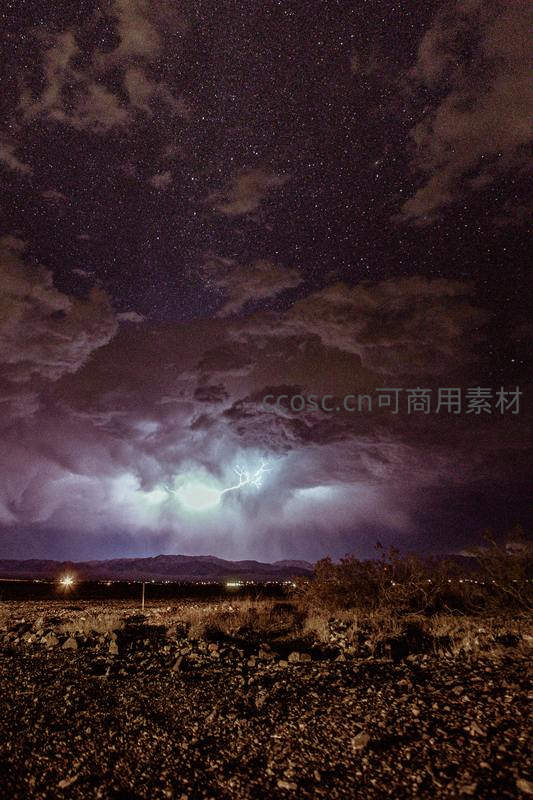 乌云密布的夜空被一道刺眼闪电撕裂,远处山脉与城镇灯火微弱,展现自然力量的震撼与紧张感。