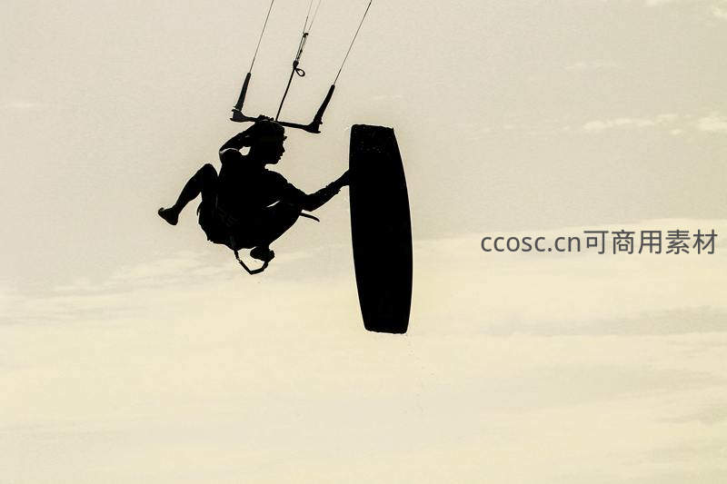一名风筝冲浪者在空中腾跃的瞬间被捕捉,其矫健的身姿与冲浪板在明亮天空背景下形成鲜明对比,充满力量感。