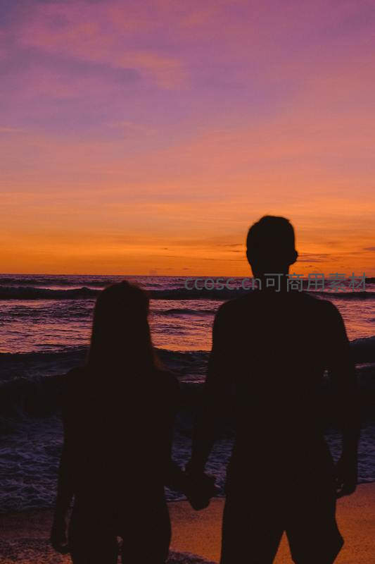 一对情侣手牵手站在海边,背对镜头凝望绚烂的日落,橙紫渐变天空与海浪交相辉映,充满温馨浪漫氛围。