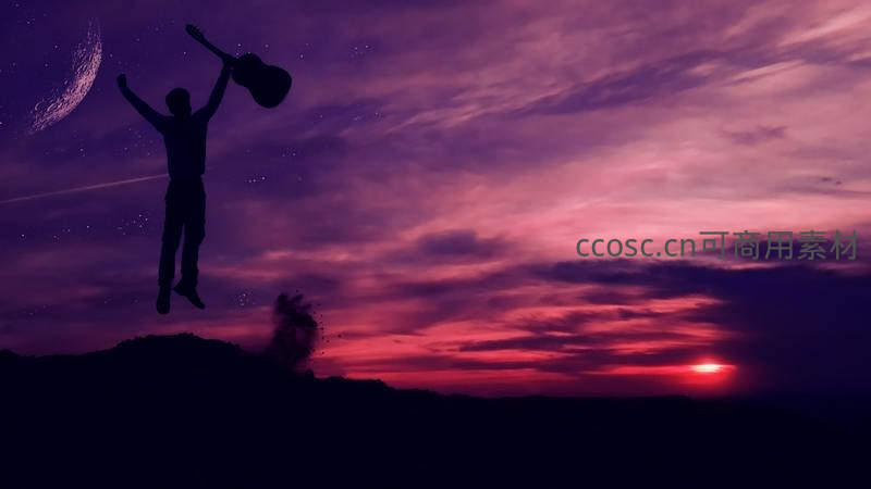 一个人在绚丽的紫色晚霞与星空下纵身跃起,高举吉他,仿佛挣脱地心引力,背景是沉落的夕阳和飘渺的云层,充满了无拘无束的自由感。