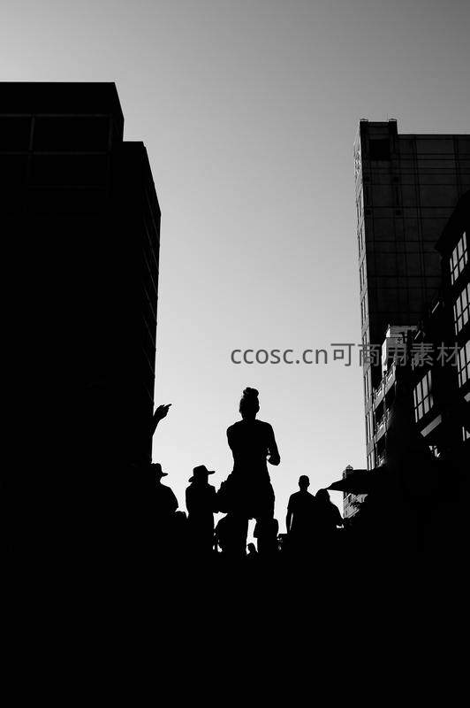 仰拍视角下,行人穿梭于摩天楼间,黑白对比强烈,展现都市节奏与现代生活的繁忙与疏离感。